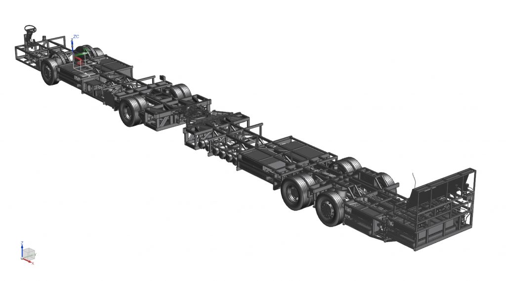 Chassi piso alto desenvolvido para aplicação urbana, especialmente aos projetos de BRT (Bus Rapid Transit), com até 23 metros de comprimento, com as seguintes características: